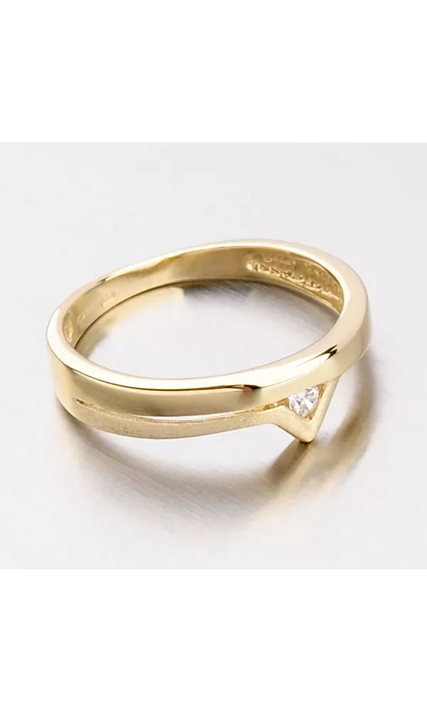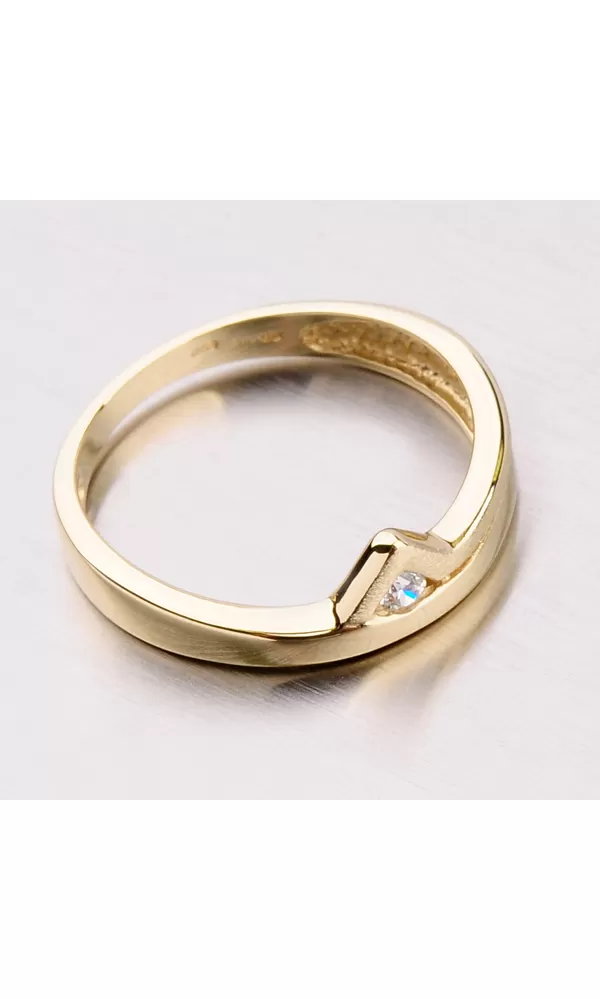 Dámsky prsteň s jedným bielym zirkónom je vyrobený zo žltého štrnásťkarátového zlata s rýdzosťou 585/1000 v kombinácii lesklej a matnej povrchovej úprave.