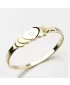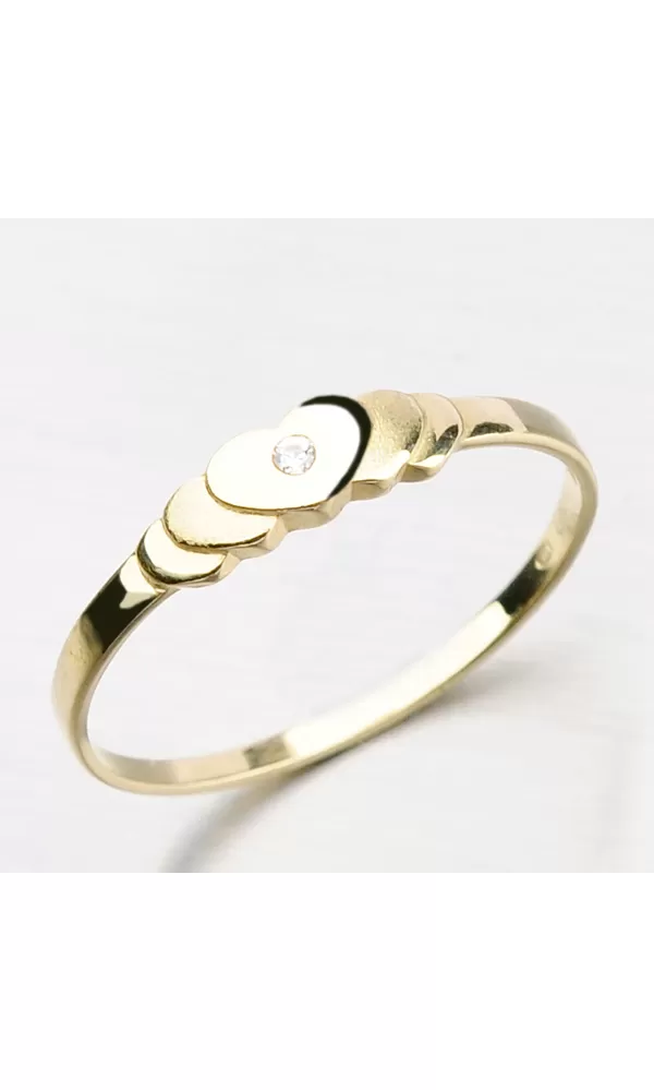 Tento nádherný prsteň dodá vášmu vzťahu romantiku a to vďaka jeho ozdobe vytvarovanej do 5 srdiečok, ktoré sa navzájom prekrývajú. Iba prostredné srdce je vidieť celé a je osadené okrúhlym zirkónom. Celý prsteň je vyrobený zo žltého štrnástich karátového zlata s rýdzosťou 585/1000 s lesklou povrchovou úpravou, iba dve schované srdiečka sú s matným povrchom.