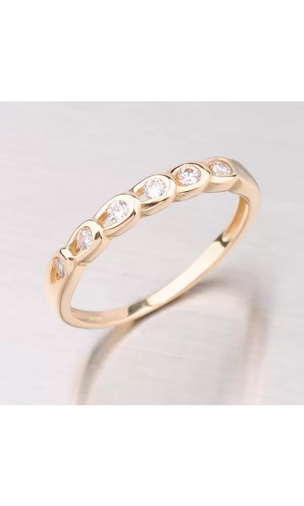 Jemný dámsky prsteň so zirkónmi je vyrobený zo žltého štrnásťkarátového zlata 585/1000 v lesklej povrchovej úprave.
