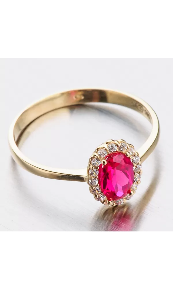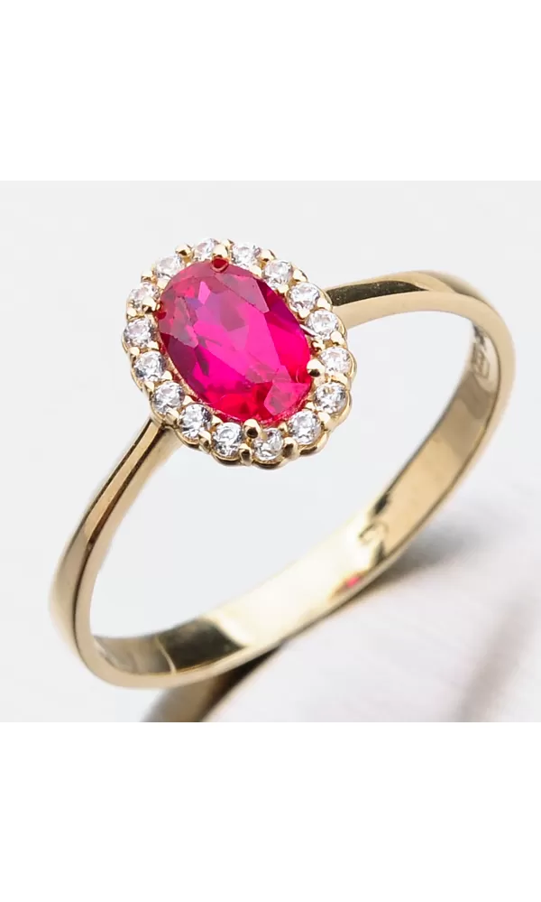 Luxusný prsteň vlastný syntetický rubín v oválnom tvare. Tento rez je vyrobený tak, aby vyniká krása tohto červeného farebného kameňa. Okolo tohto červeného kameňa sú v brilantnom strihu nastavené zirkóny. Zirkóny sú starostlivo pripevnené v Krapnách, čo im bráni vypadávať. Prsteň je nezameniteľný a bude jedným z vašich obľúbených šperkov, ktoré vlastníte a máte vo svojej šperkovej skrinke.