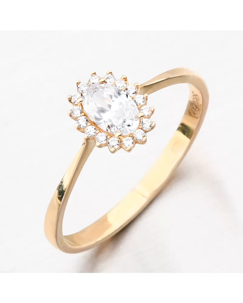 Originální zlatý prsten oválného tvaru pestře zdobený zirkony a středovým bílým kamenem. Ve středu je jeden výraznější oválný zirkon a poté po celém obvodu drobnější kulaté zirkony. Kulaté zirkony jsou briliantového brusu, zajišťuje maximální brilanci vybroušených facet, dokonale odráží světlo a neuvěřitelně září z každého úhlu pohledu. Udělejte radost svým blízkým nebo také sama sobě.