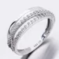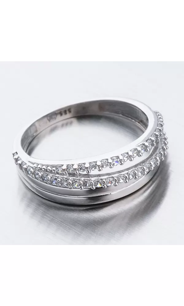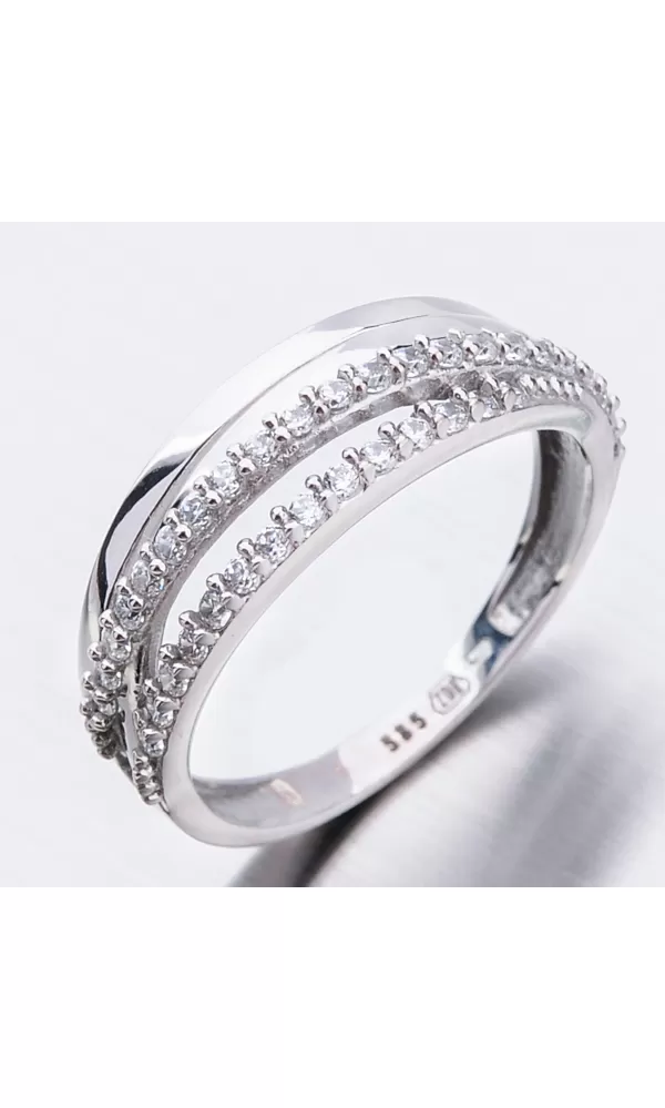 Moderný ženský prsteň sa skladá z línií, ktoré nie sú vpredu spojené. Dvaja z nich sú leštené na vysoký lesk a dva sú bohato vysadené v brilantnom strihu. Toto brúsenie do zirkónov poskytuje brilanciu skutočných diamantov.