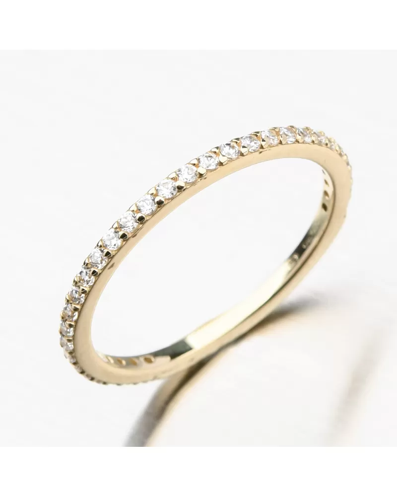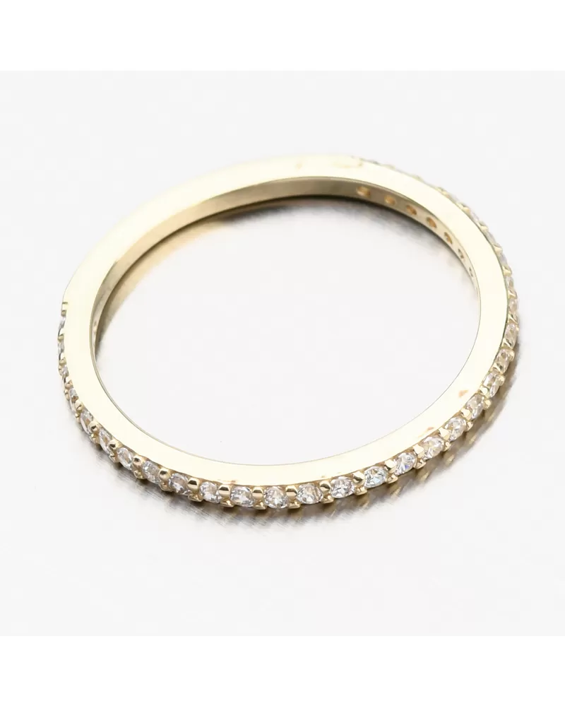 Zlatý dámsky prsteň v jednoduchom prevedení, ktoré zaistí ľahkú kombinovateľnosť s ďalšími prsteňmi či inými šperkami. Zlatý prsteň vyniká praktickým spracovaním. Nemusíte sa báť zadrhávania o sveter alebo o vlasy. Predná a bočná časť je zdobená žiarivými zirkónmi. Zirkóny sú briliantového brusu, ktorý zaisťuje maximálnu brilanciu vybrúsených facet, dokonale odráža svetlo a neuveriteľne žiari z každého uhla pohľadu. Zlatý prsteň vyniká praktickým spracovaním. Nemusíte sa báť zadrhávania o sveter alebo o vlasy. Povrch je vo vysokom lesku.