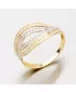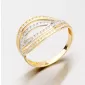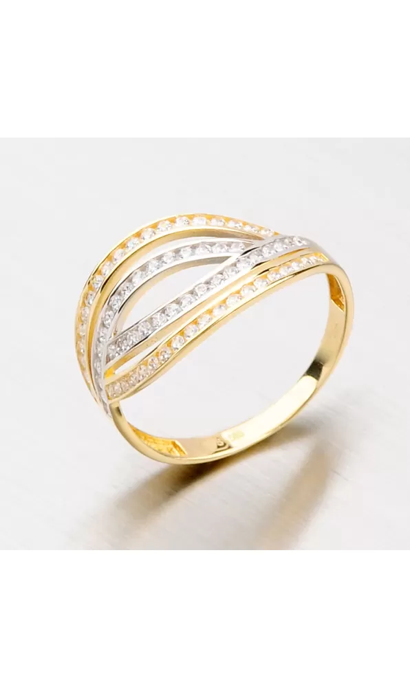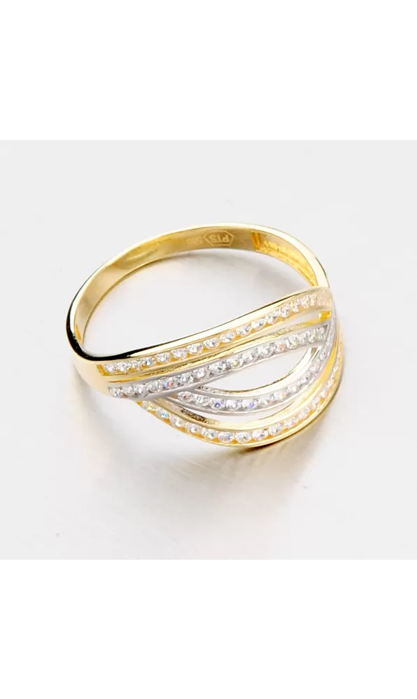 Výrazný dámsky prsteň so zirkónmi vyrobený zo štrnásťkarátového zlata 585/1000 v kombinácii žltej a bielej farby zlata av lesklej povrchovej úprave Prsteň je zdobený žiarivými zirkónmi, ktoré sú vsadené na prednej časti prsteňa do štyroch prepletených radov.