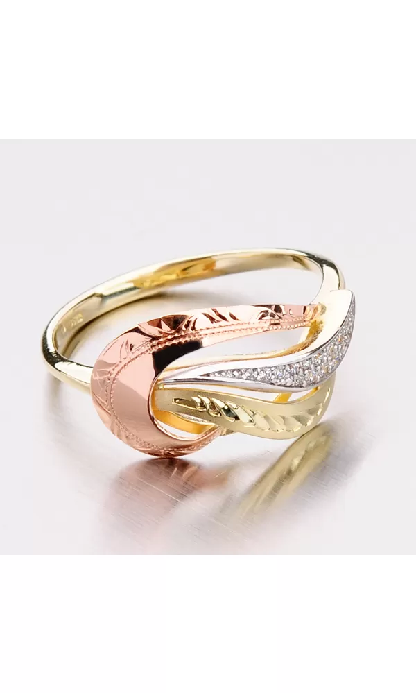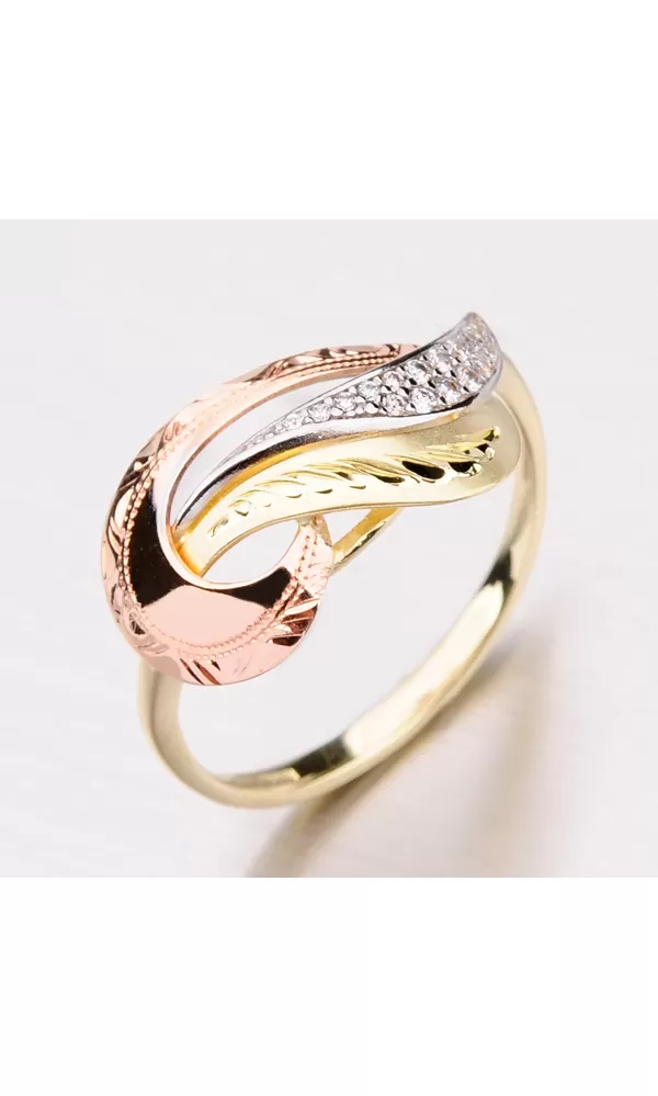 Nádherný, extravagantný prsteň bude dominantou na Vašej ruke. Prsteň je vyrobený zo štrnásťkarátového zlata 585/1000 v kombinácii bielej, červenej a žltej farby. Prostredné esíčko je vysadené zirkónmi a krajné výlisky sú zdobené ručným rytím. Podporte svoj vzhľad týmto neprehliadnuteľným zlatým prsteňom. K prsteňu je možné dokúpiť do súpravy prívesok 53P-3110 a náušnice 52NK-3111. Tento šperk bol skontrolovaný puncovým úradom, ktorý overil jeho kvalitu a označil štátnym puncom pre danú rýdzosť.