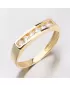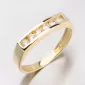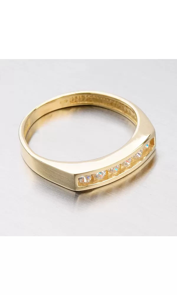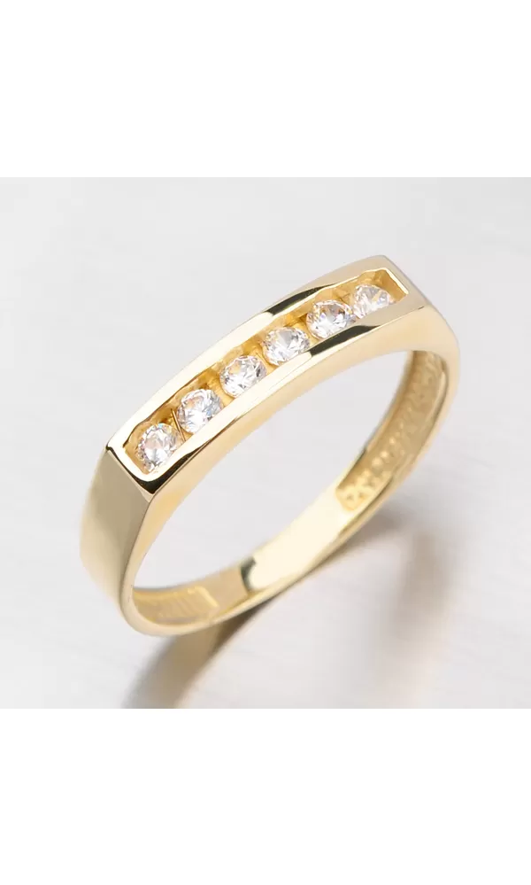 Symetrický prsteň vyrobený zo štrnástich karátového žltého zlata s rýdzosťou 585/1000 si zamilujete a nebudete ho chcieť zložiť. Prsteň je vyrobený v lesklej povrchovej úprave a je osadený šiestimi žiarivými zirkónmi v bielej farbe v jednom rade.