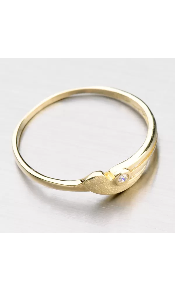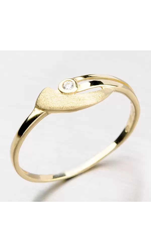 Tento krásny dámsky prsteň je vyrobený zo žltého štrnástich karátového zlata o rýdzosti 585/1000. Prsteň má matnú a lesklú povrchovú úpravu a je osadený zirkónom vybrúseným do briliantového tvaru. Prsteň bol skontrolovaný puncovým úradom, ktorý overil jeho kvalitu a označil štátnym puncom pre danú rýdzosť.