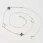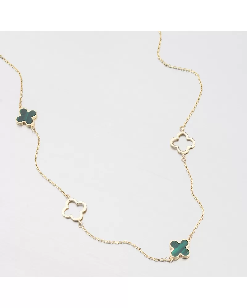 Tento zlatý náhrdelník zdobia štyri jemné štvorlístky, z toho dva v zelenom odtieni a potom dva obrysy štvorlístkov. Prívesky podčiarkujú krásu náhrdelníka a dodávajú celému šperku luxusný vzhľad inšpirovaný svetovými dizajnmi.