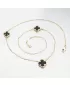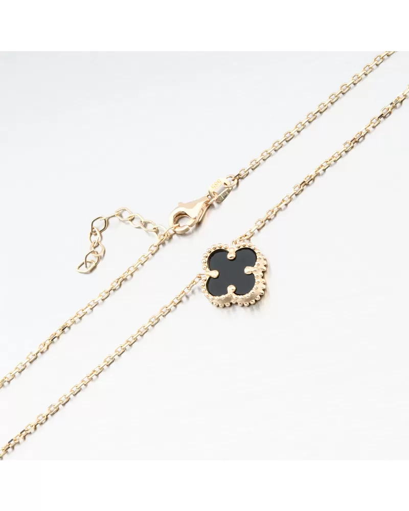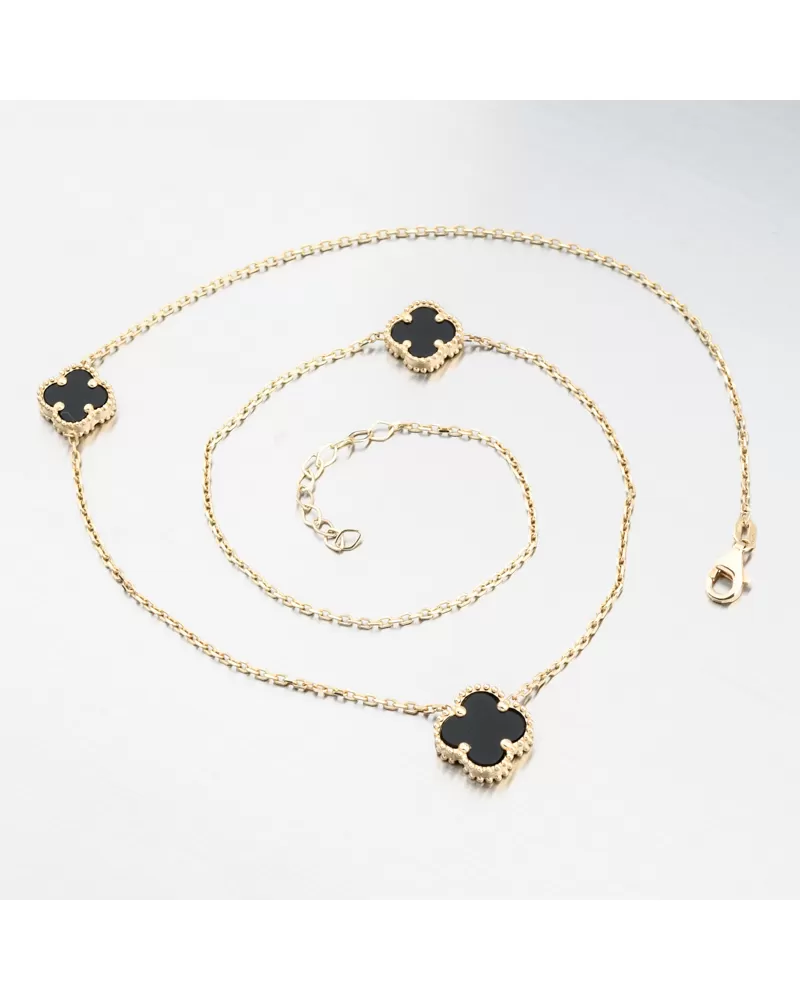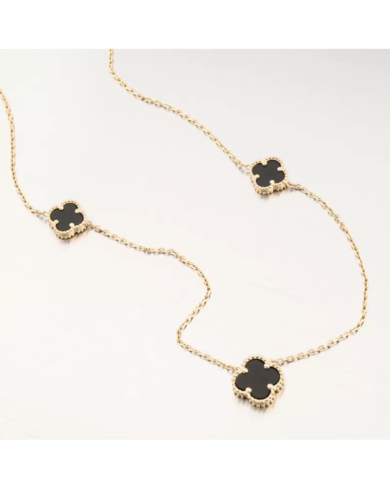 Osobitý, moderný a dokonale vyvážený dizajn. Tento zlatý náhrdelník obsahuje tri čierne štvorlístky zasadené v ozdobnom zlatom ráme. Hladký čierny kameň vytvára elegantný kontrast so zlatom, vďaka čomu vyzerá kúsok luxusne a nezameniteľne.