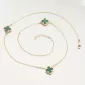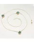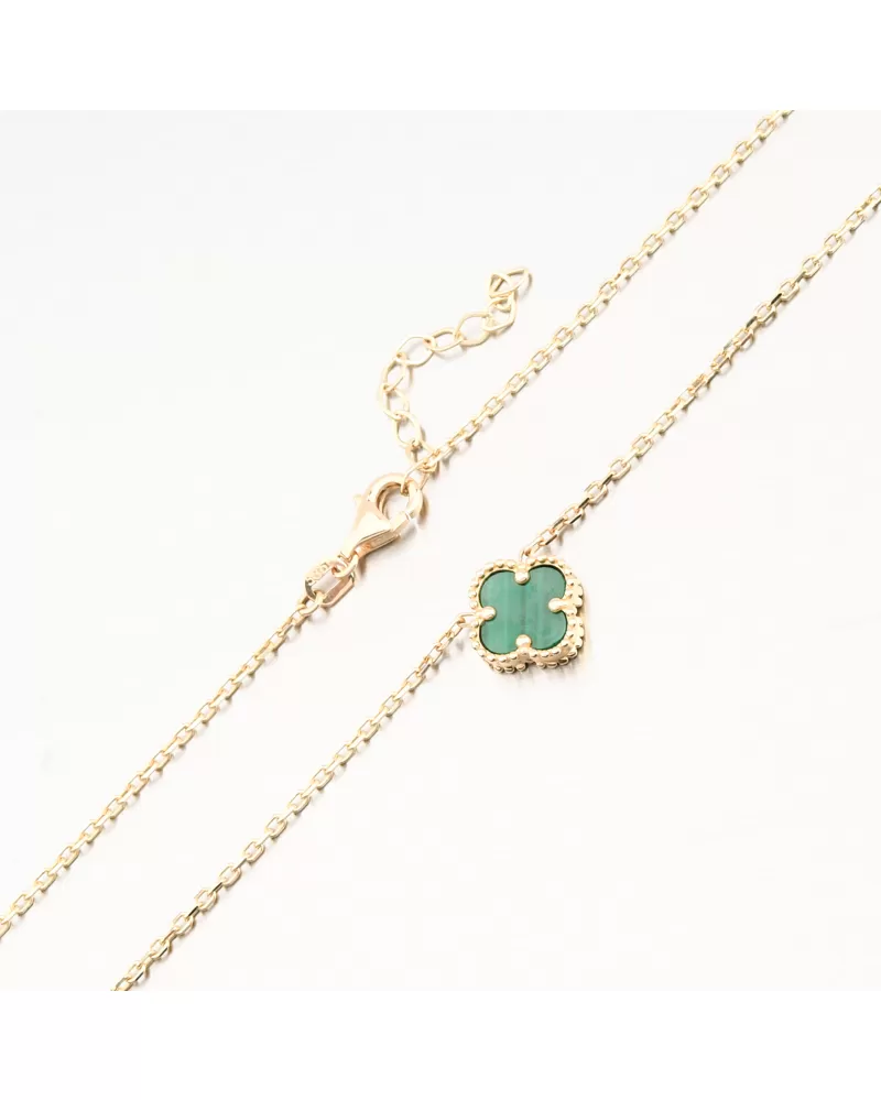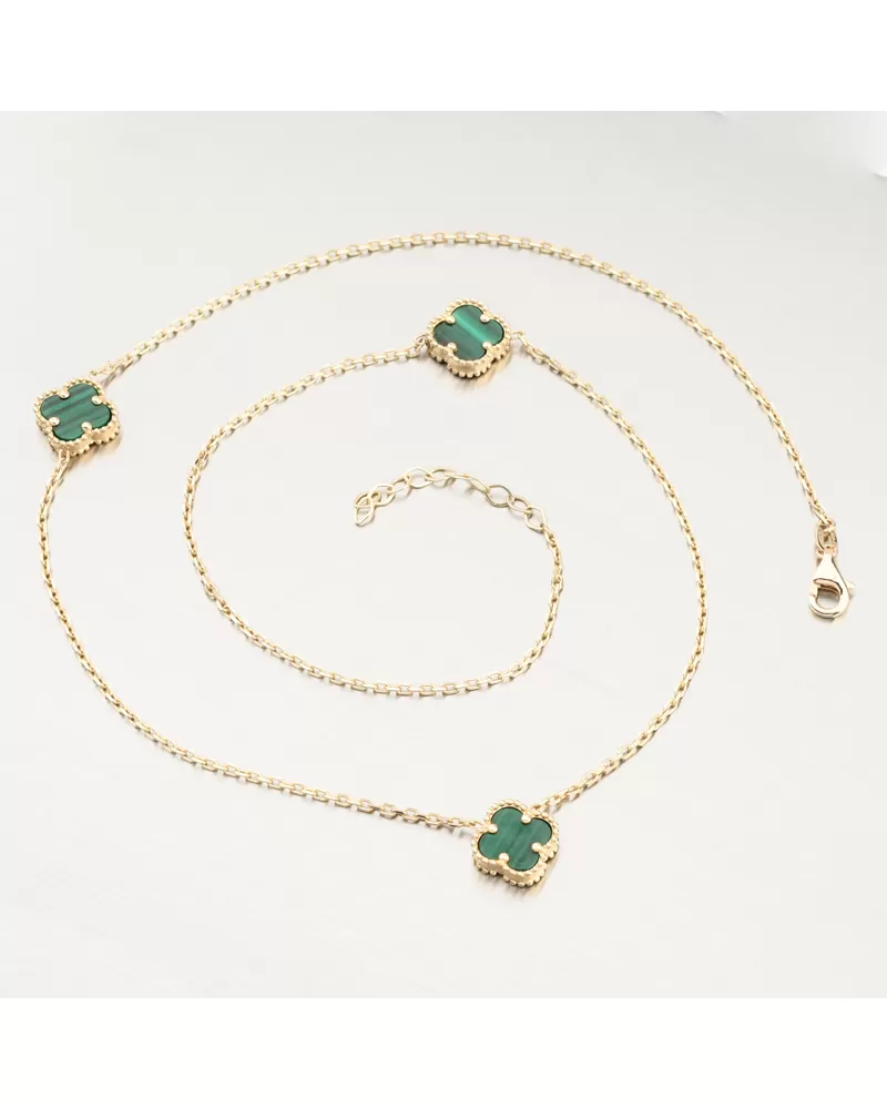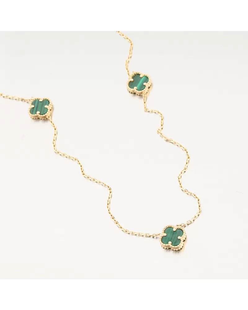 Tento zlatý náhrdelník zdobia tri jemné štvorlístky v sýtozelenom odtieni. Každý štvorlístok je osadený v ozdobnom zlatom ráme, ktorý zvýrazňuje jeho krásu a dodáva celému šperku luxusný vzhľad inšpirovaný svetovými dizajnmi.