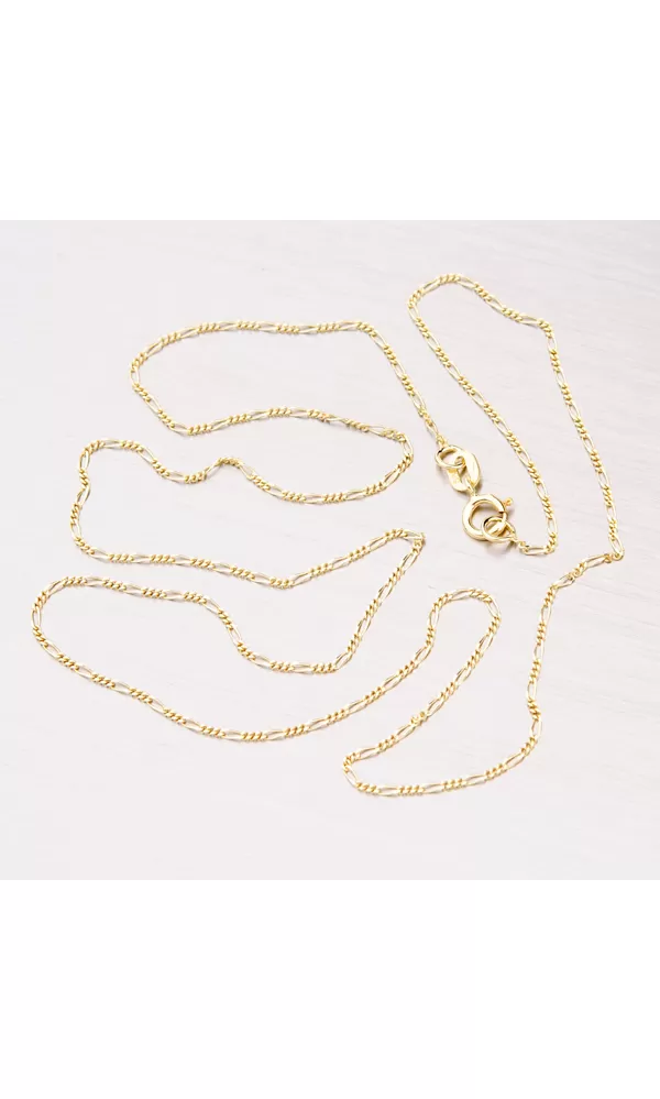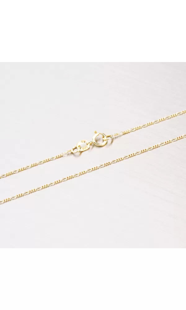 Zlatá retiazka známeho vzoru FIGARO so zapínaním na perový krúžok zaujme ako ženy, tak aj mužov. Táto retiazka je vyrobená zo žltého štrnásťkarátového zlata 585/1000. Retiazka typu Figaro je tvorená jemne valcovými oválnymi očkami, ktoré sa v pravidelných intervaloch striedajú s tromi okrúhlymi očkami. Šírka očiek je 1 mm, dĺžku retiazky si vyberte podľa dostupných rozmerov.