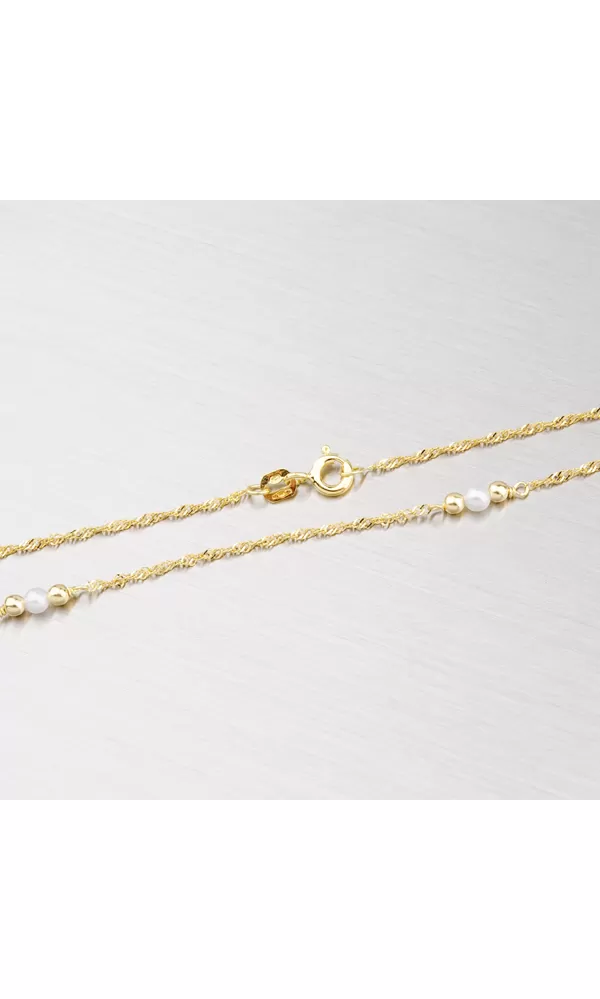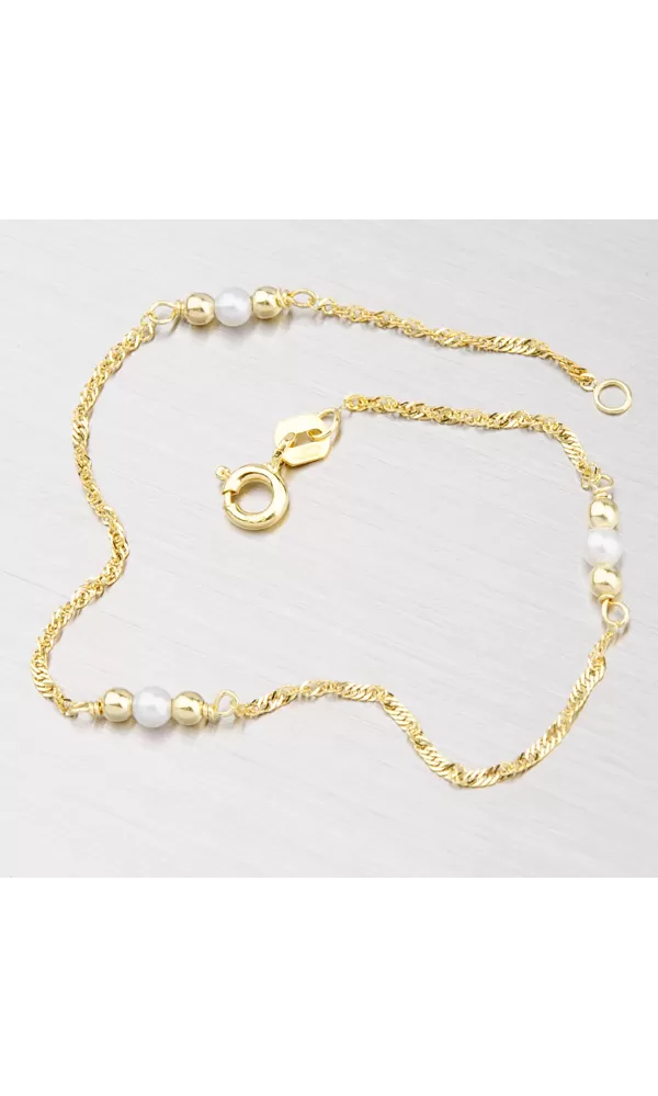 Retiazka typu lambada s tromi perličkami bielej farby vyrobená zo žltého štrnásťkarátového zlata 585/000 v lesklej povrchovej úprave so zapínaním na perový krúžok. Retiazka vďaka perličkám dokonale vynikne. Navyše lambada je krútený náramok a práve to krútenie vytvára dokonalý efekt a dokonalý ligot ako sa cez náramok láme svetlo. Ozdobte sa dokonalým šperkom, ktorý vás nadchne.