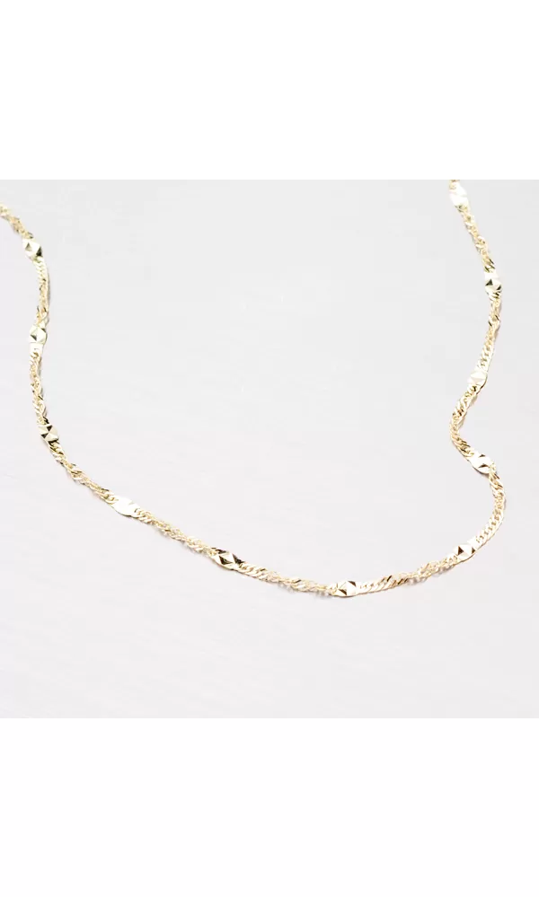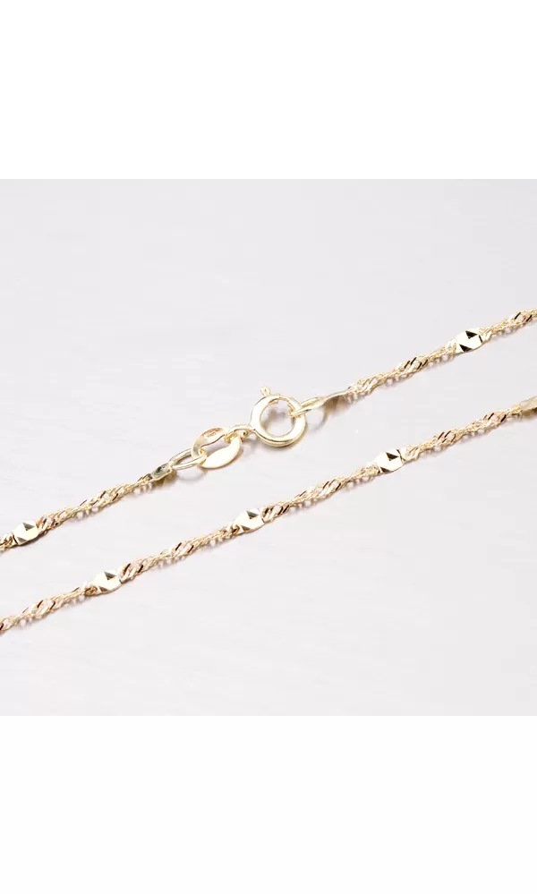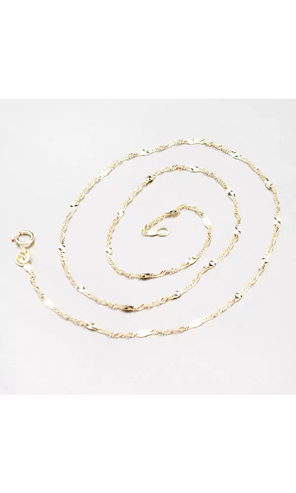 Táto veľmi zaujímavá retiazka je vyrobená zo žltého štrnástich karátového zlata s rýdzosťou 585/1000 a zaujme svojimi plôškami, ktoré sú povrchovo upravené lesklými facetami robenými za pomoci diamantového hrotu. Originálne spracovanie Vás neprestane baviť. Táto retiazka sa stane obľúbeným šperkom, ktorý nebudete chcieť zložiť. Retiazka sa zapína na bezpečnú karabínu.