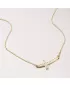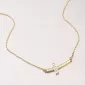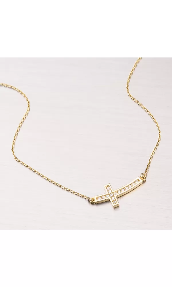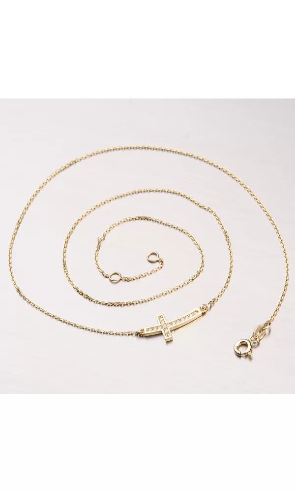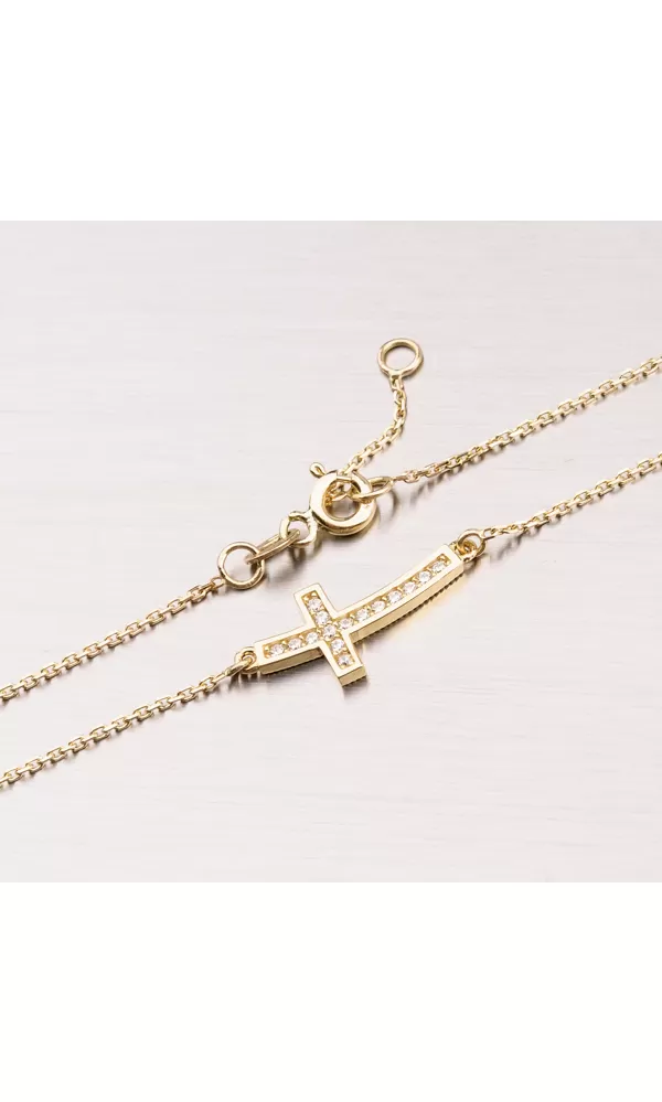 Módny náhrdelník je tvorený z retiazky a prívesku v tvare kríža. Prívesok je pevne uchytený a zdobený je precízne vsadenými zirkónmi v briliantovom bruse. Náhrdelník je vyrobený zo žltého štrnásťkarátového zlata 585/000 v lesklej povrchovej úprave so zapínaním na perový krúžok. Dĺžka náhrdelníka je 42 cm, s využitím retiazky 3 cm, je možné náhrdelník zapnúť v dĺžke 42 až 45 cm.