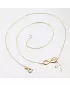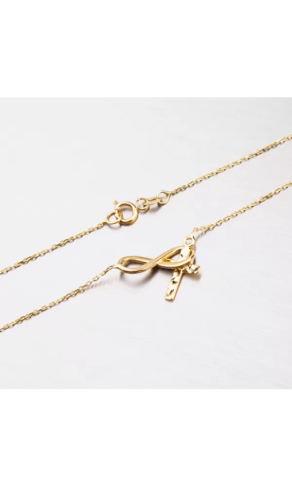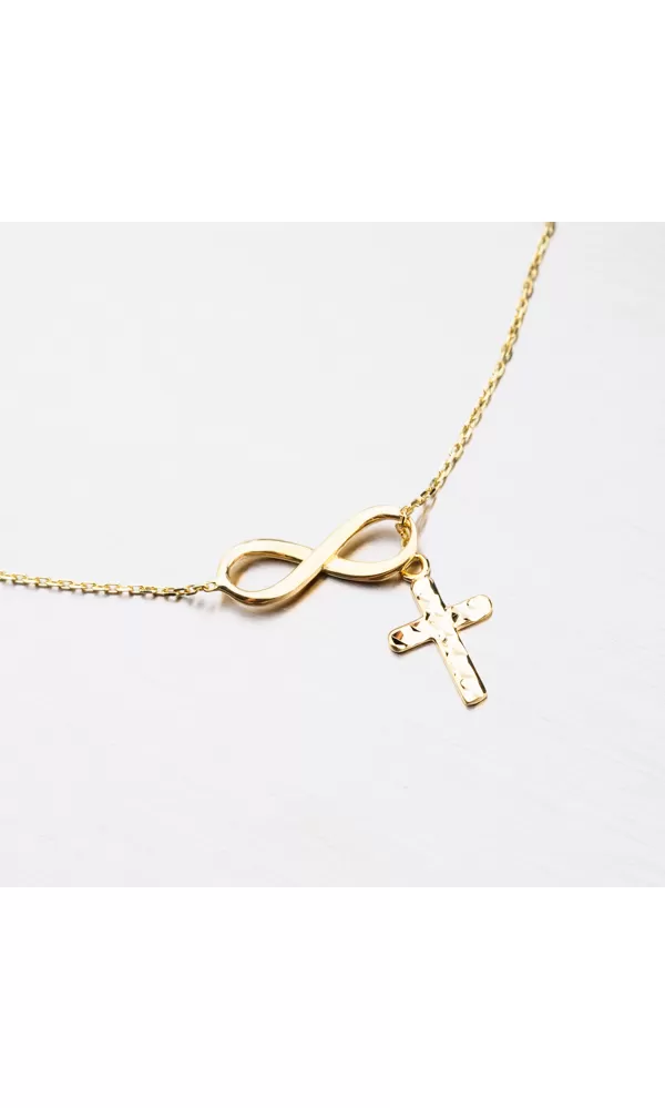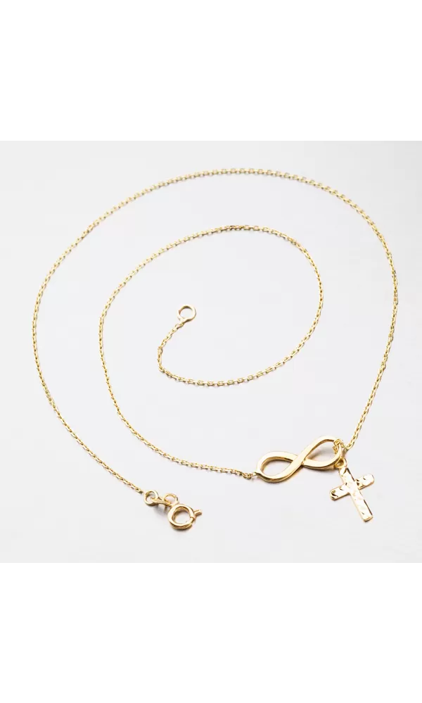 Zaujmite originálnym šperkom. Tento náhrdelník je zložený z dvoch retiazok, ktoré majú spoločné zapínanie na perový krúžok. Jeden z retiazok zdobí ležatá osmička alebo nekonečno a druhú retiazku má ako prívesok zlatý kríž, ktorý je zdobený gravírovaním. Zlatý krížik je prevlečený cez očko ležaté osmičky a voľne visí do dekoltu.