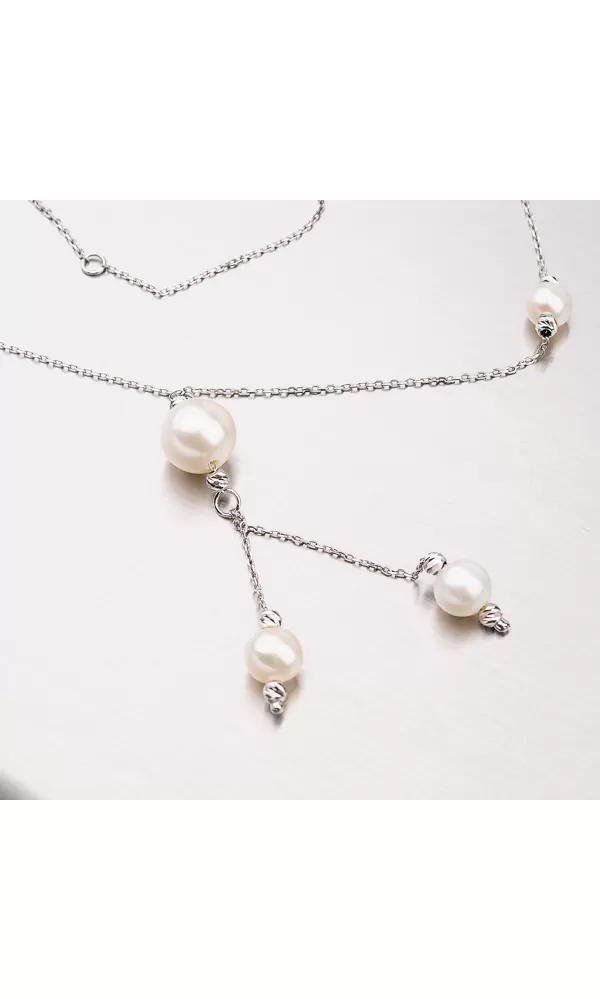 Naši šikovní zlatníci pre vás vytvorili tento prekrásny náhrdelník, ktorý je tvorený z pravých perál. Pravé perly v bielej farbe sú použité v dvoch veľkostiach. Uprostred je perla s priemerom 8,5 mm a ďalších šesť perál je s priemerom 5,5 mm. Okolo perál sú guličky, ktoré perly zvýrazňujú. Guličky sú zdobené gravírovaním pomocou diamantového hrotu, ktorý šperku dodáva maximálny lesk a brilanciu zo všetkých uhlov.