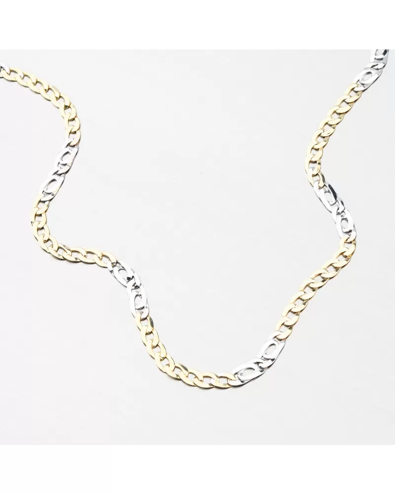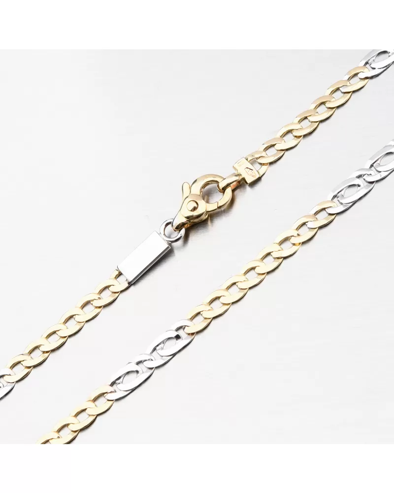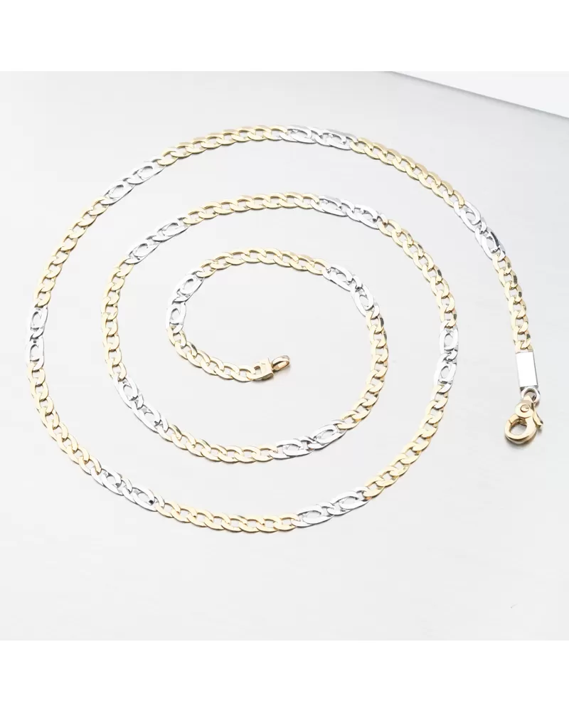 Veľmi obľúbený typ retiazky, ktorá je na prvý pohľad unisex. Striedajú sa tu prepletené očká v žltej farbe zlata s dvojitými prepletenými očkami v bielej farbe. Pri tejto retiazke sa nemusíte báť, že sa len tak pretrhne. Retiazka sa príjemne nosí a je pevná so zapínaním na karabínu.